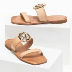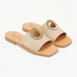 Αγορά 😍 Καλύτερη πώληση 🥰 IRIS Σανδάλια δερμάτινα Flat με V μεταλλικό διακοσμητικό – Φυσικό ❤️ ⭐