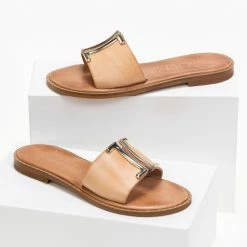Κουπόνι 🎁 Ολοκαίνουργιο ❤️ IRIS Σανδάλια δερμάτινα Flat με V μεταλλικό διακοσμητικό – Καφέ ✨ 🧨