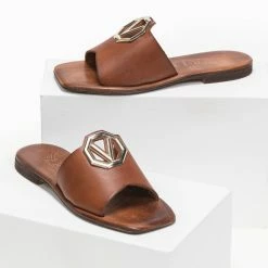 Κουπόνι 🛒 Πολύ καλή προσφορά 🔥 IRIS Σανδάλια δερμάτινα καρέ με μέταλλο και V σχέδιο – Καφέ 👍 🎉