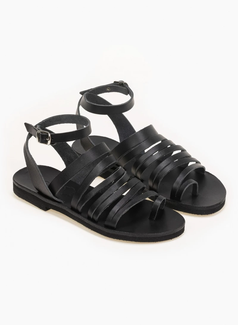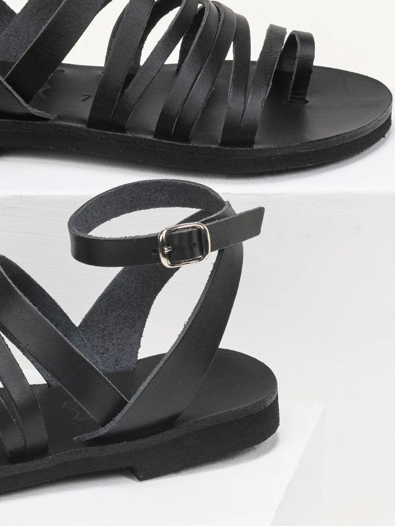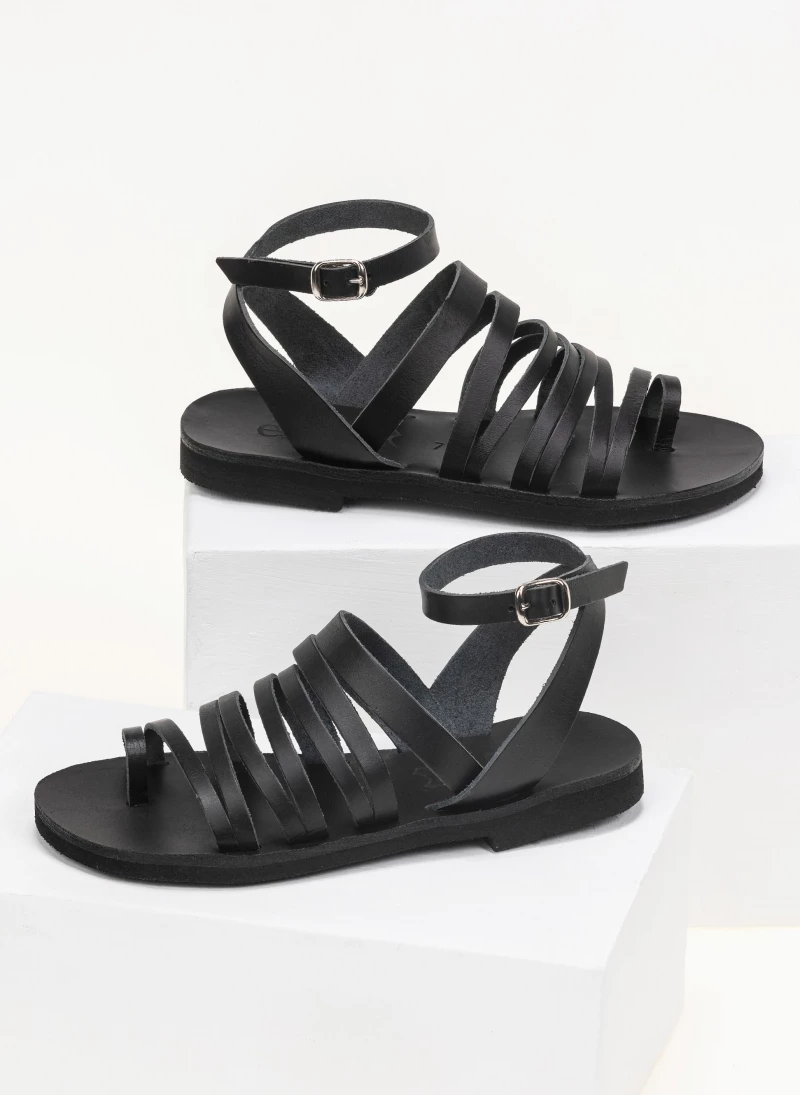 Estil δερμάτινα ίσια πέδιλα με λεπτά λουράκια. Δένουν στο ύψος του αστραγάλου. Ελληνικής κατασκευής, χειροποίητα.