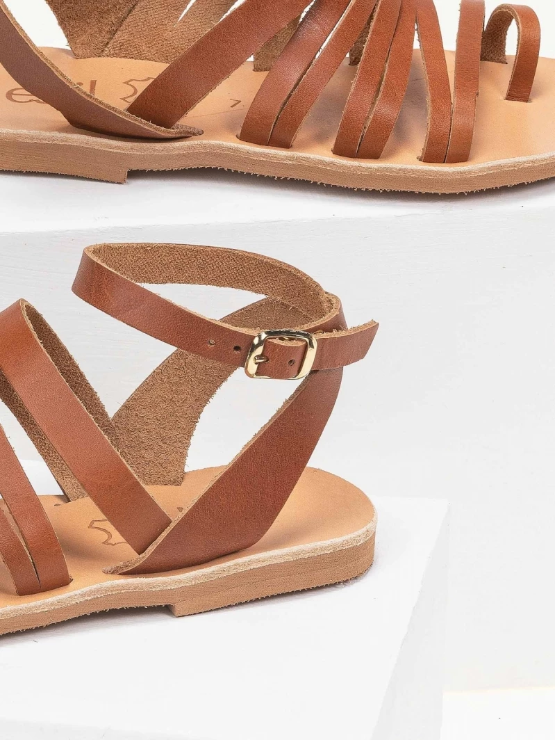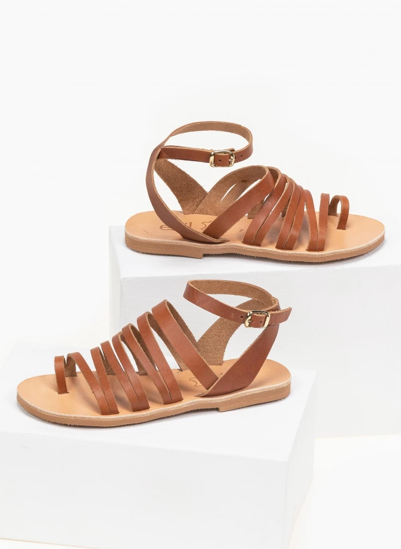 Estil δερμάτινα ίσια πέδιλα με λεπτά λουράκια. Δένουν στο ύψος του αστραγάλου. Ελληνικής κατασκευής, χειροποίητα.
