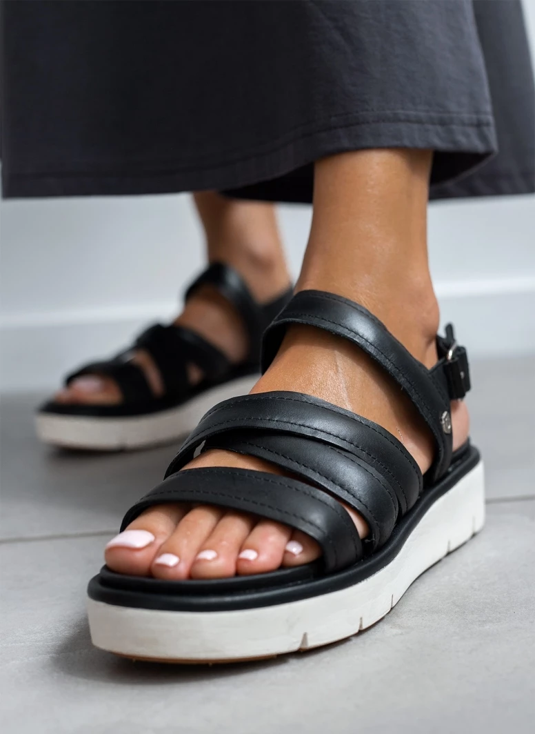 Flatform δερμάτινα πέδιλα με φαρδιά λουράκια.Έχουν μικρό μεταλλικό στοιχείο στην εξωτερική τους πλευρά.Δένουν στο πλάι.