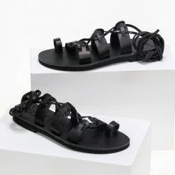 Δερμάτινα ίσια lace up πέδιλα. Δένουν με κορδόνια στη γάμπα. Ελληνικής κατασκευής, χειροποίητα.