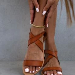 Χειροποίητα δερμάτινα ίσια πέδιλα. Δένουν με χιαστί λουράκια στο ύψος του κουτεπιέ. Ελληνικής κατασκευής.