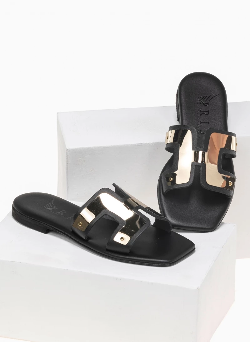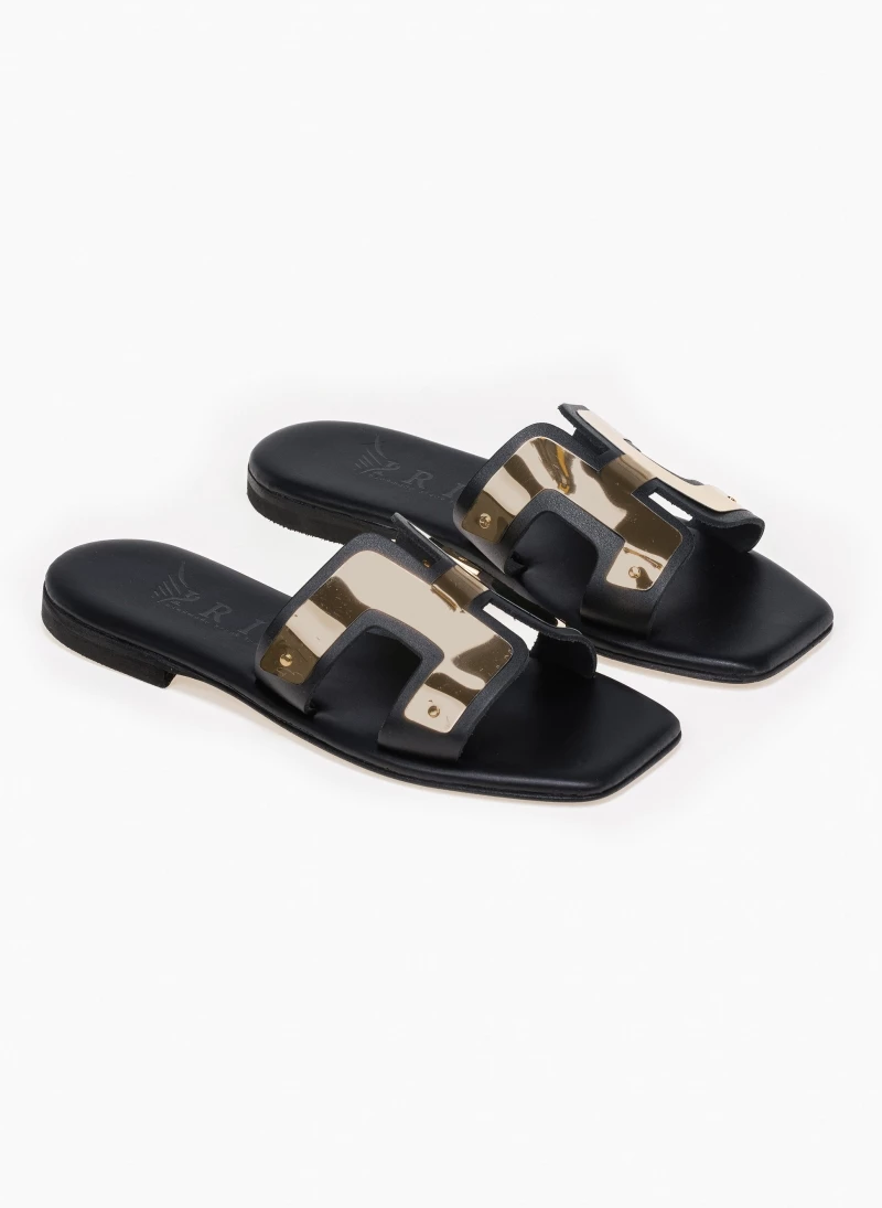 Καρλε δερμάτινα ίσια πέδιλα με μεταλλική λεπτομέρεια. Έχουν ανοίγματα στο πλάι. Δερμάτινος πάτος. Ελληνικής κατασκευής, χειροποίητα.