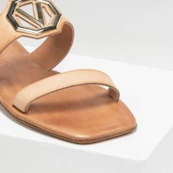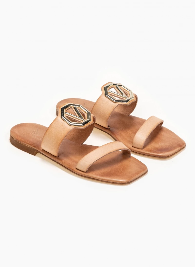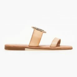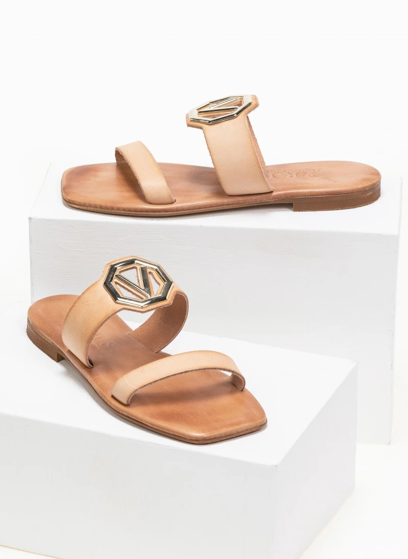 Αγορά 😍 Καλύτερη πώληση 🥰 IRIS Σανδάλια δερμάτινα Flat με V μεταλλικό διακοσμητικό – Φυσικό ❤️ ⭐