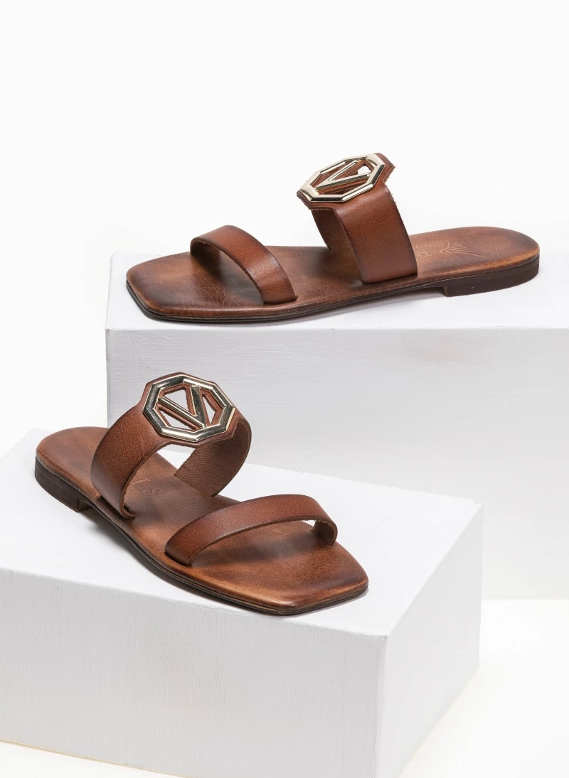 Flat δερμάτινα σανδάλια με δύο φάσες και V μεταλλικό διακοσμητικό. Έχει δερμάτινο πάτο με ενίσχυση. Ελληνικής κατασκευής, χειροποίητα.