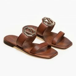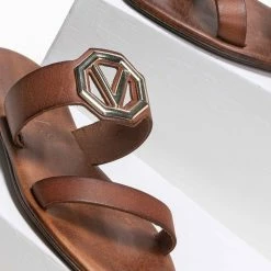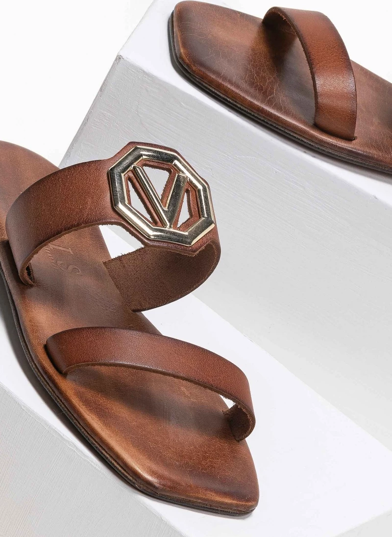Κουπόνι 🎁 Ολοκαίνουργιο ❤️ IRIS Σανδάλια δερμάτινα Flat με V μεταλλικό διακοσμητικό – Καφέ ✨ 🧨