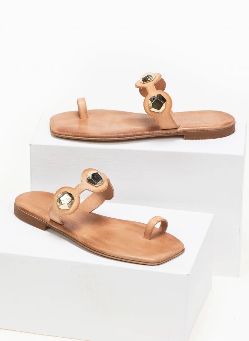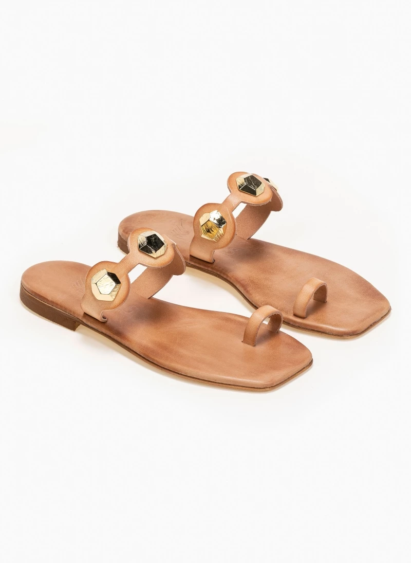 Καρέ δερμάτινα σανδάλια με πολύγωνο μεταλλικό διακοσμητικό. Ελληνικής κατασκευής, χειροποίητα.