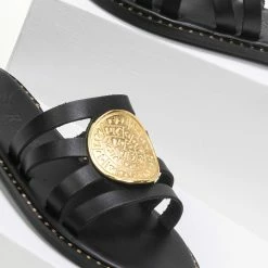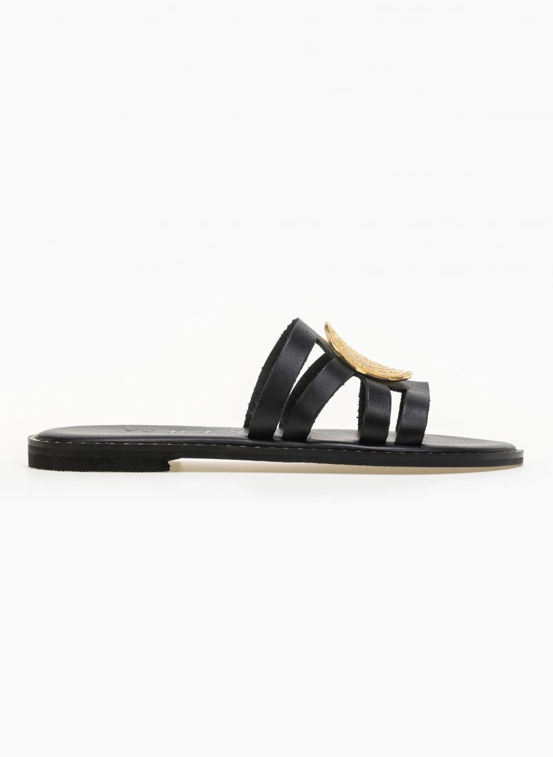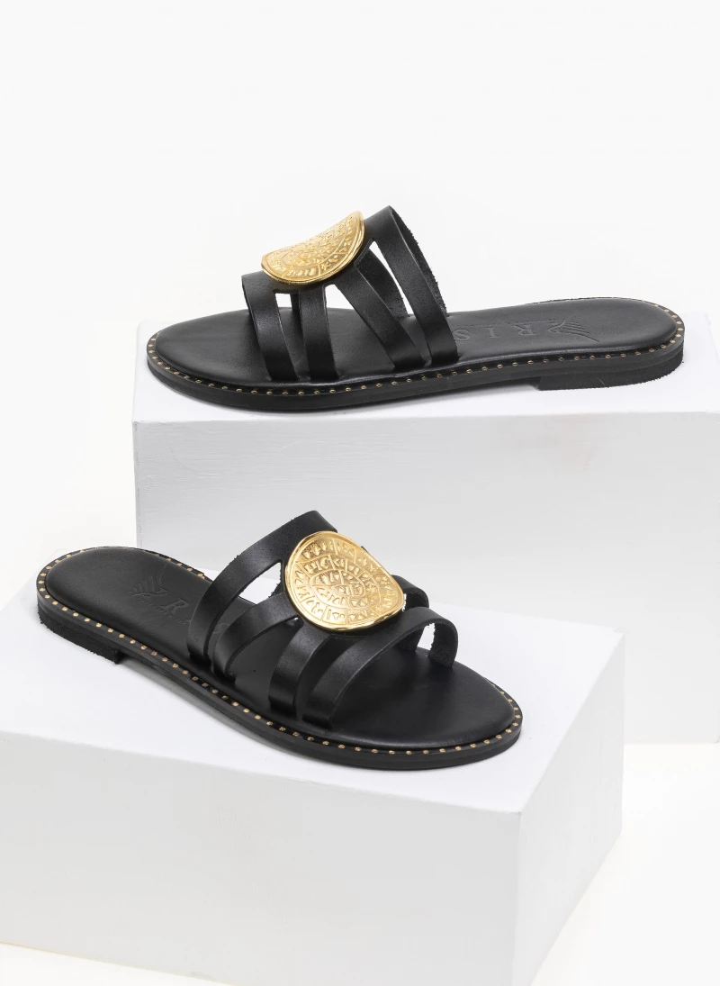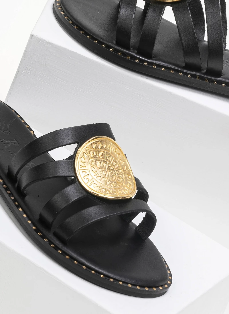Δερμάτινα σανδάλια με μεγάλο στρογγυλό διακοσμητικό με ανάγλυφο σχέδιο. Ο πάτος είναι δερμάτινος με ενίσχυση. Έχουν λεπτομέρεια μεταλλικό χρώμα περιμετρικά της σόλας. Ελληνικής κατασκευής, χειροποίητα.