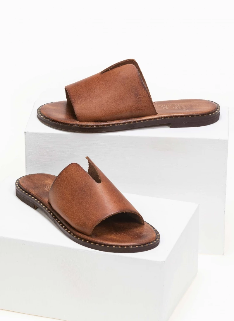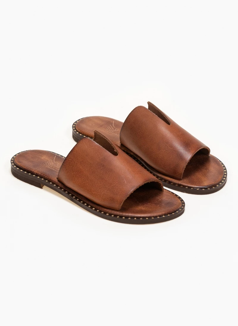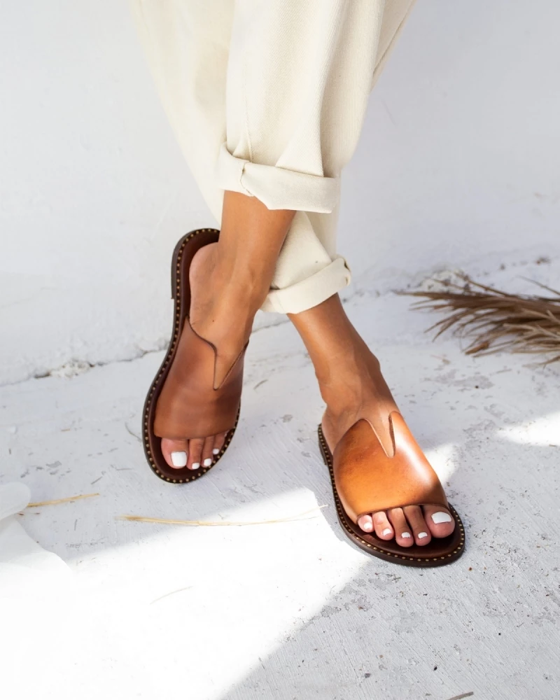 Δερμάτινα σανδάλια με χωστή φάσα με άνοιγμα. Ο πάτος είναι δερμάτινος με ενίσχυση. Έχουν λεπτομέρεια σε χρυσό χρώμα περιμετρικά της σόλας. Ελληνικής κατασκευής, χειροποίητα.