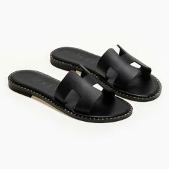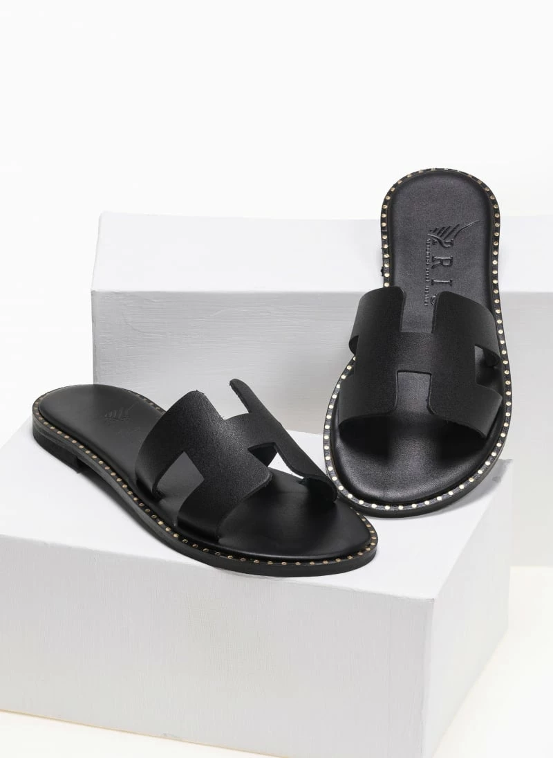 Δερμάτινα φλατ σανδάλια με ανοίγματα στη φάσα. Ο πάτος είναι δερμάτινος με ενίσχυση. Έχουν λεπτομέρεια μεταλλικό χρώμα περιμετρικά της σόλας. Ελληνικής κατασκευής, χειροποίητα.