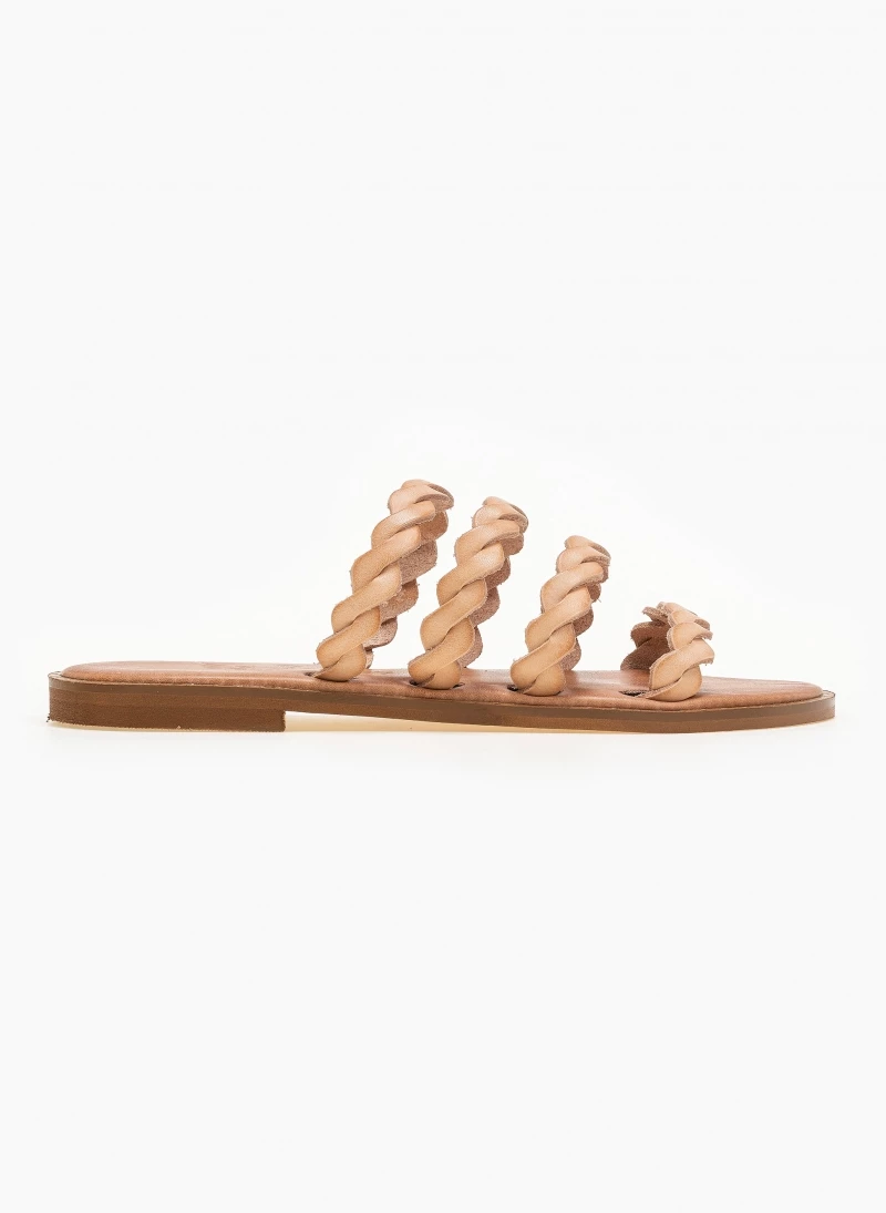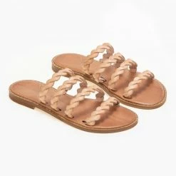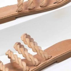 Δερμάτινα φλατ σανδάλια με πλεγμένα λουράκια. Ο πάτος είναι δερμάτινος με ενίσχυση. Έχουν λεπτομέρεια μεταλλικό χρώμα περιμετρικά της σόλας. Ελληνικής κατασκευής, χειροποίητα.