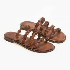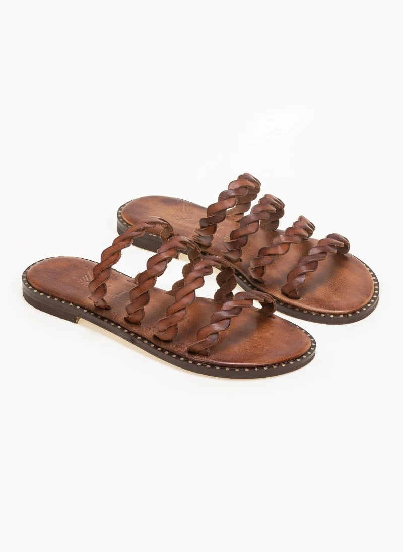 Δερμάτινα φλατ σανδάλια με πλεγμένα λουράκια. Ο πάτος είναι δερμάτινος με ενίσχυση. Έχουν λεπτομέρεια μεταλλικό χρώμα περιμετρικά της σόλας. Ελληνικής κατασκευής, χειροποίητα.