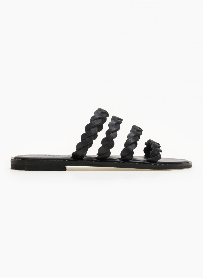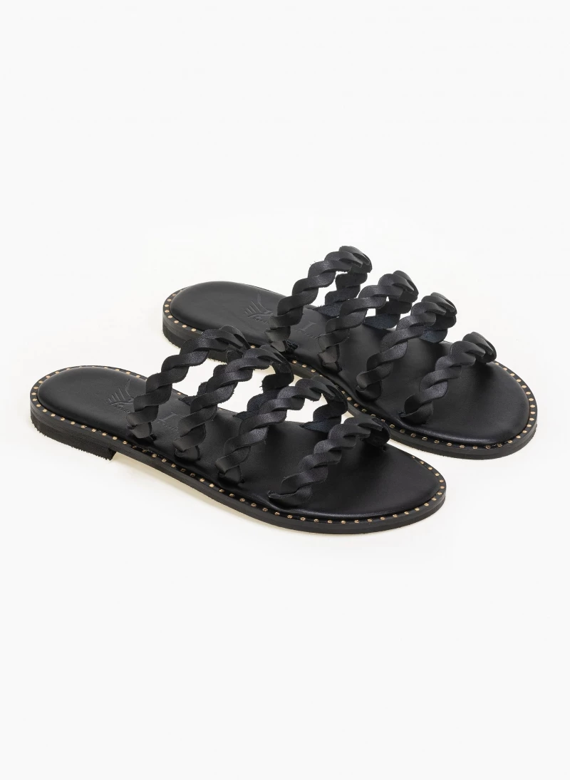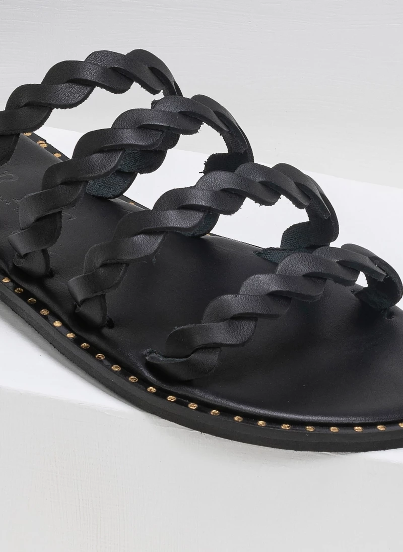 Δερμάτινα φλατ σανδάλια με πλεγμένα λουράκια. Ο πάτος είναι δερμάτινος με ενίσχυση. Έχουν λεπτομέρεια μεταλλικό χρώμα περιμετρικά της σόλας. Ελληνικής κατασκευής, χειροποίητα.