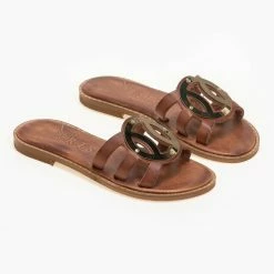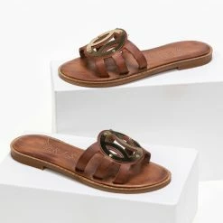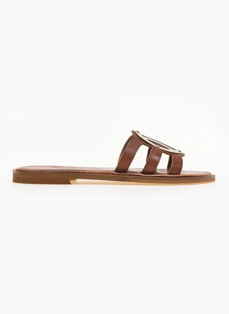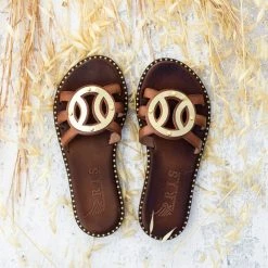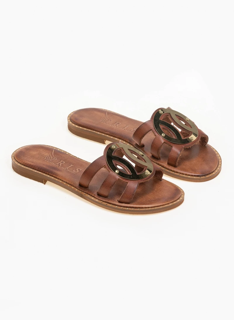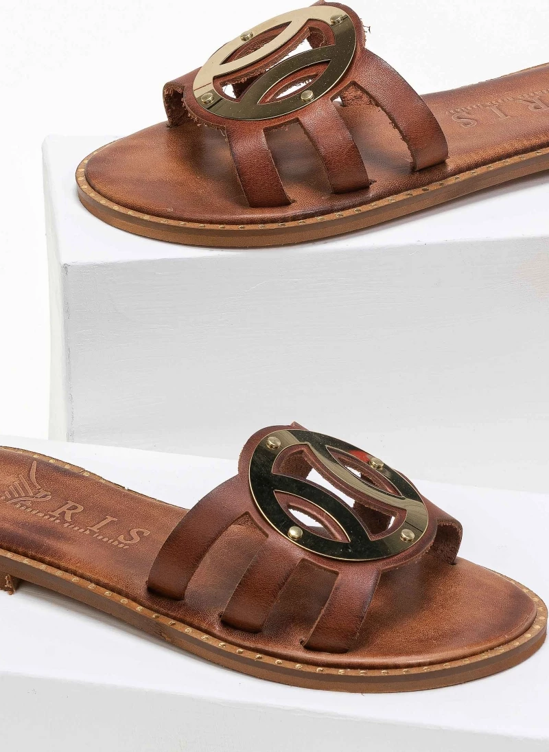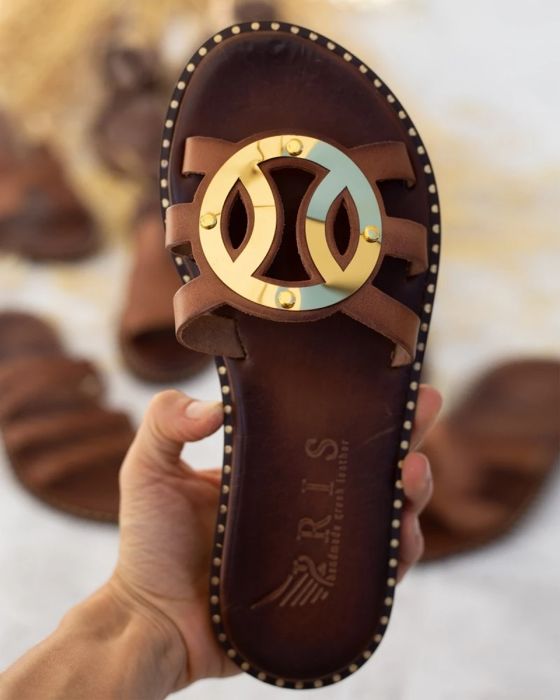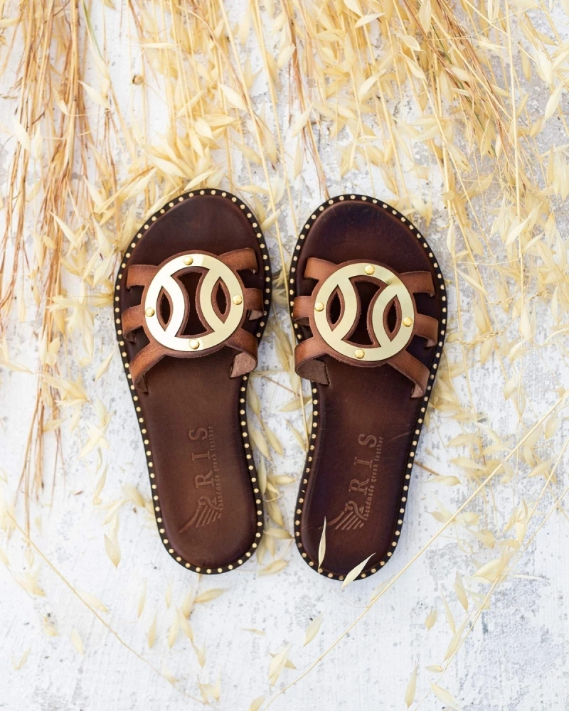 Αγορά 🔥 Κουπόνι 🔔 IRIS Σανδάλια δερμάτινα με στρογγυλή αγκράφα – Καφέ 💯 ⌛