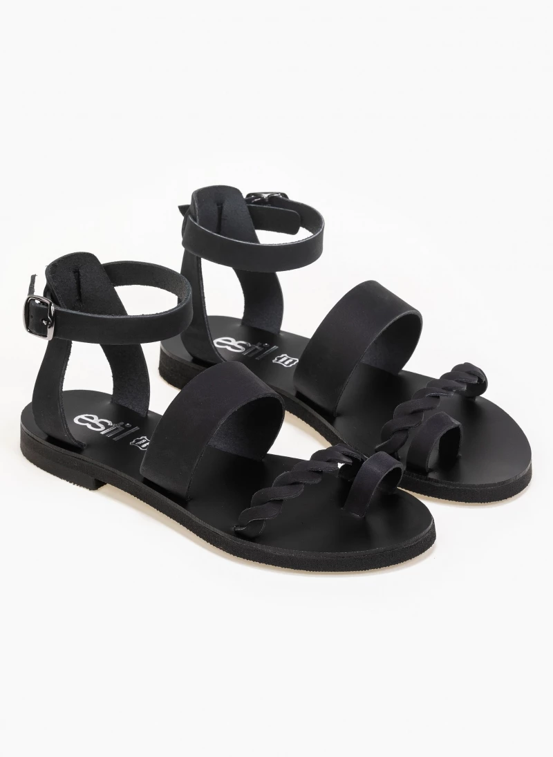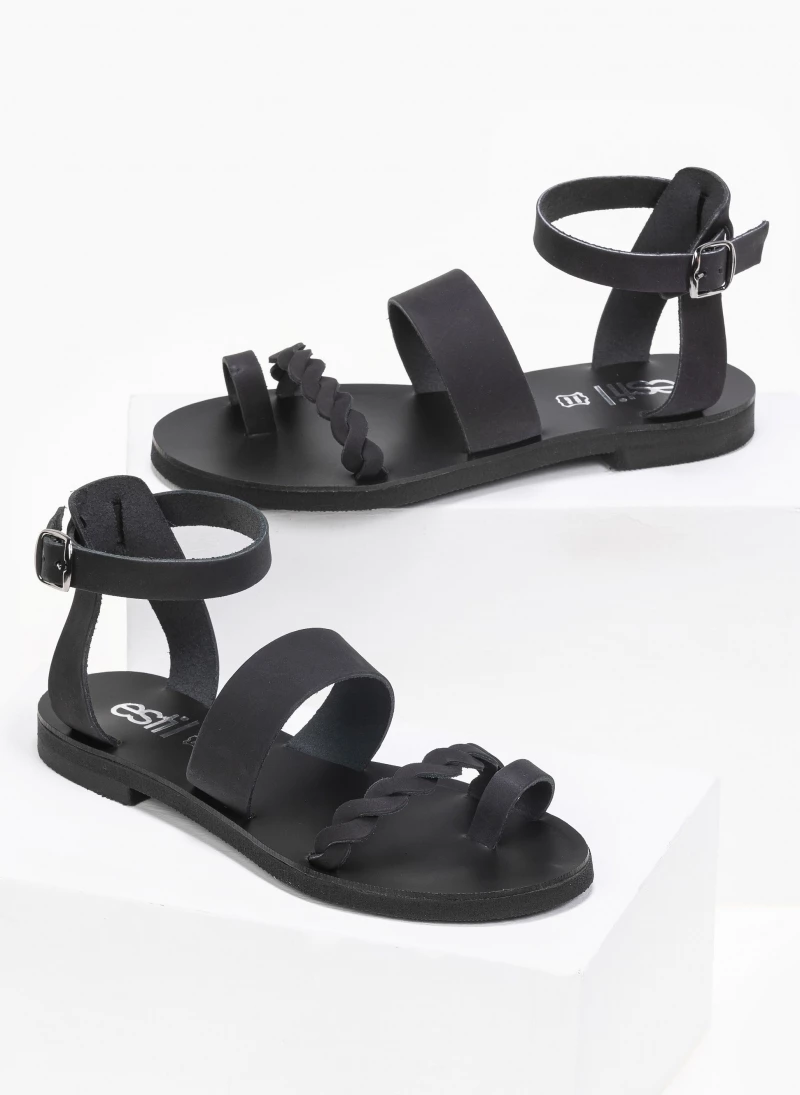 Estil nubuck δερμάτινα ίσια πέδιλα. Έχουν πλεγμένο λουράκι στο κουτεπιέ και δένουν με μπαρέτα στο ύψος του αστραγάλου. Ελληνικής κατασκευής, χειροποίητα.