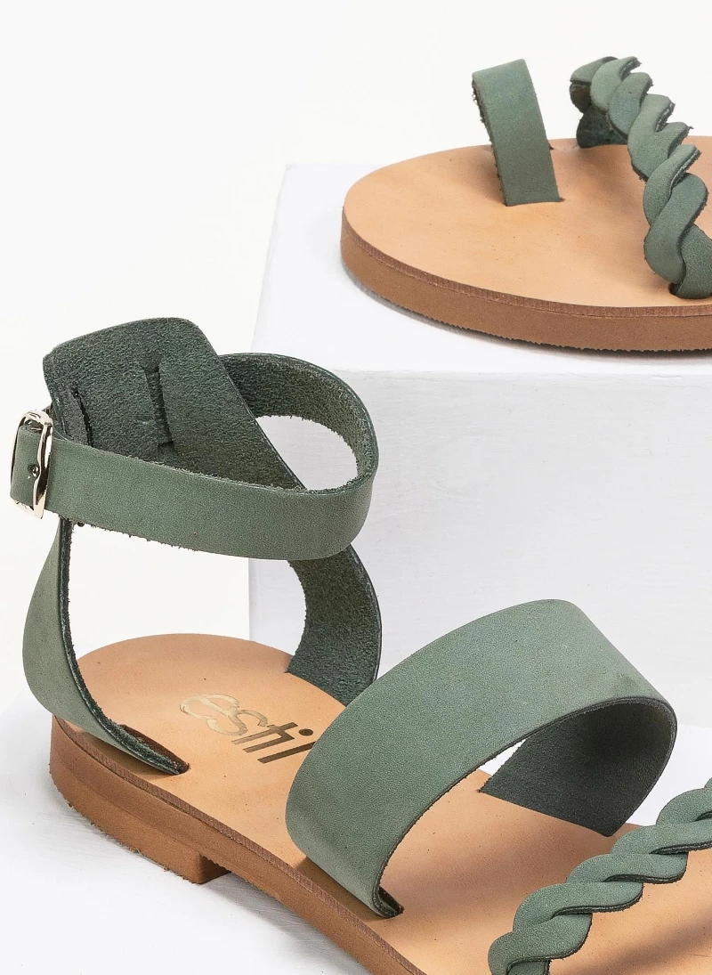 Estil nubuck δερμάτινα ίσια πέδιλα. Έχουν πλεγμένο λουράκι στο κουτεπιέ και δένουν με μπαρέτα στο ύψος του αστραγάλου. Ελληνικής κατασκευής, χειροποίητα.