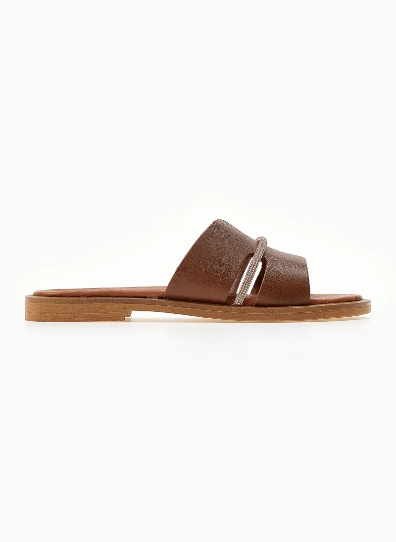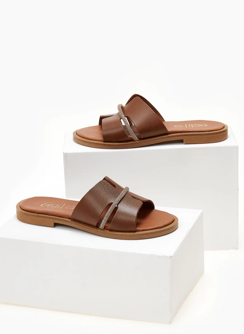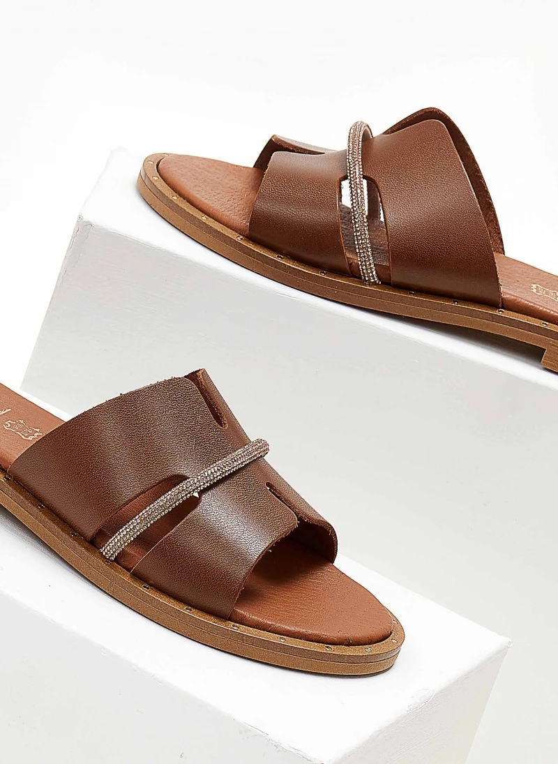 Σανδάλια δερμάτινα ESTIL με φαρδιά φάσα με ανοίγματα. Έχουν λεπτή σειρά strass. Λεπτομέρεια μεταλλικό χρώμα περιμετρικά της σόλας. Δερμάτινος πάτος με ενίσχυση. Ελληνικής κατασκευής.