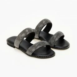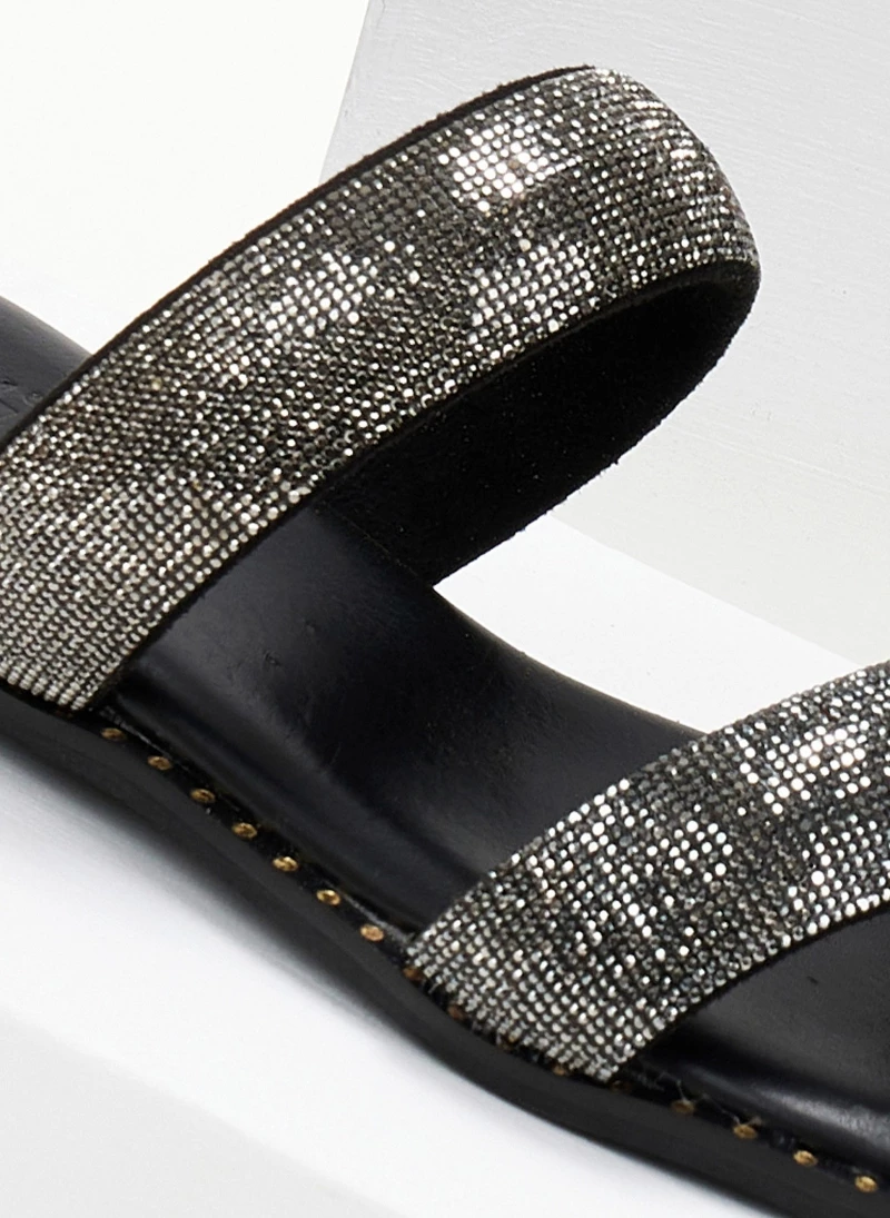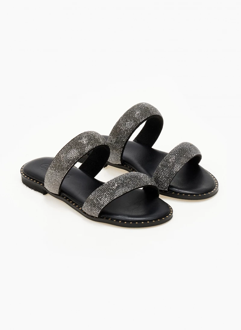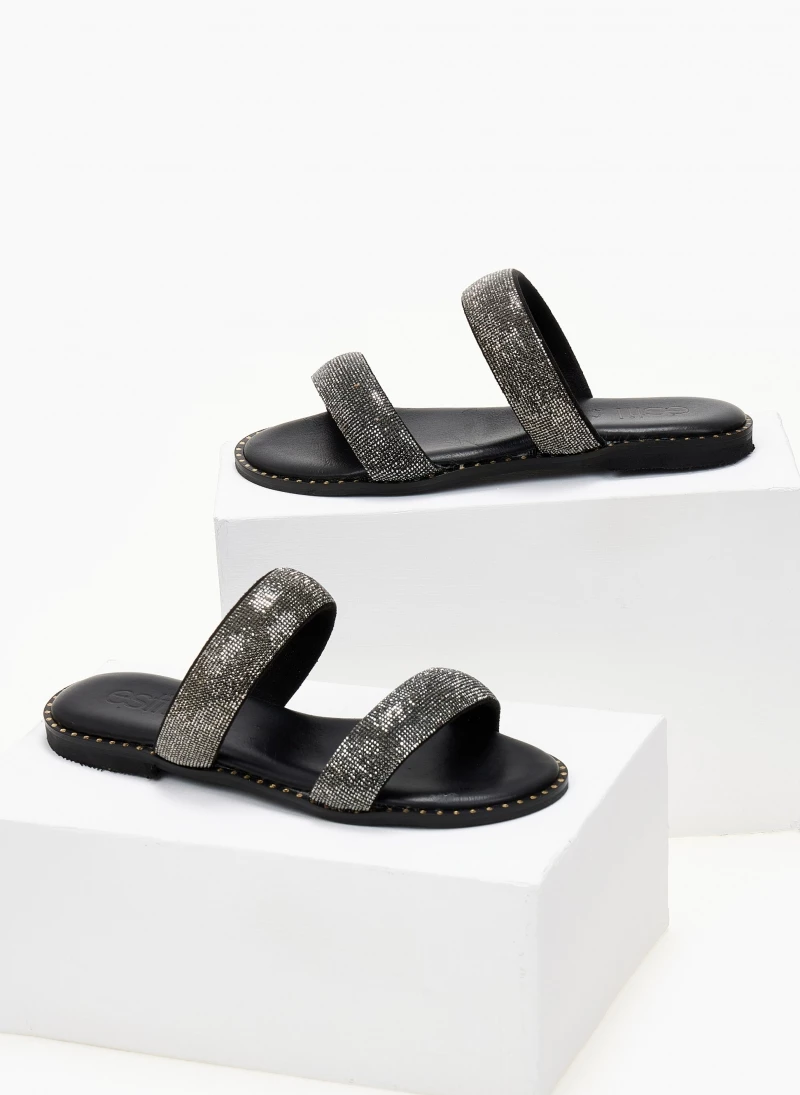 Σανδάλια δερμάτινα ESTIL με δύο strass φάσες. Έχουν λεπτομέρεια μεταλλικό χρώμα περιμετρικάτης σόλας. Δερμάτινος πάτος με ενίσχυση. Ελληνικής κατασκευής.