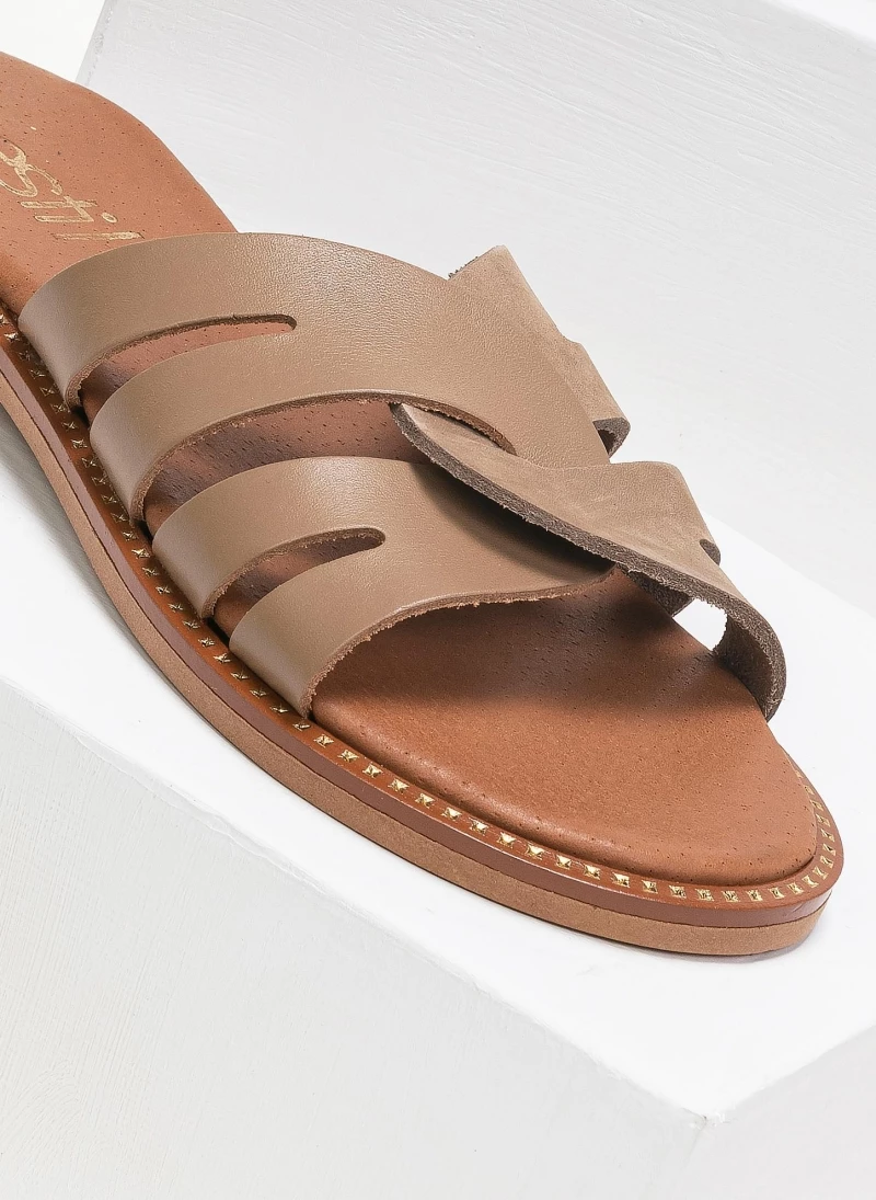 Estil δερμάτινα σανδάλια με περαστές φάσες. Έχουν δερμάτινο πάτο με ενίσχυση. Η σολα είναι μαλακή από λάστιχο και έχει λεπτομέρειες σε χρυσό χρώμα. Ελληνικής κατασκευής, χειροποίητα.