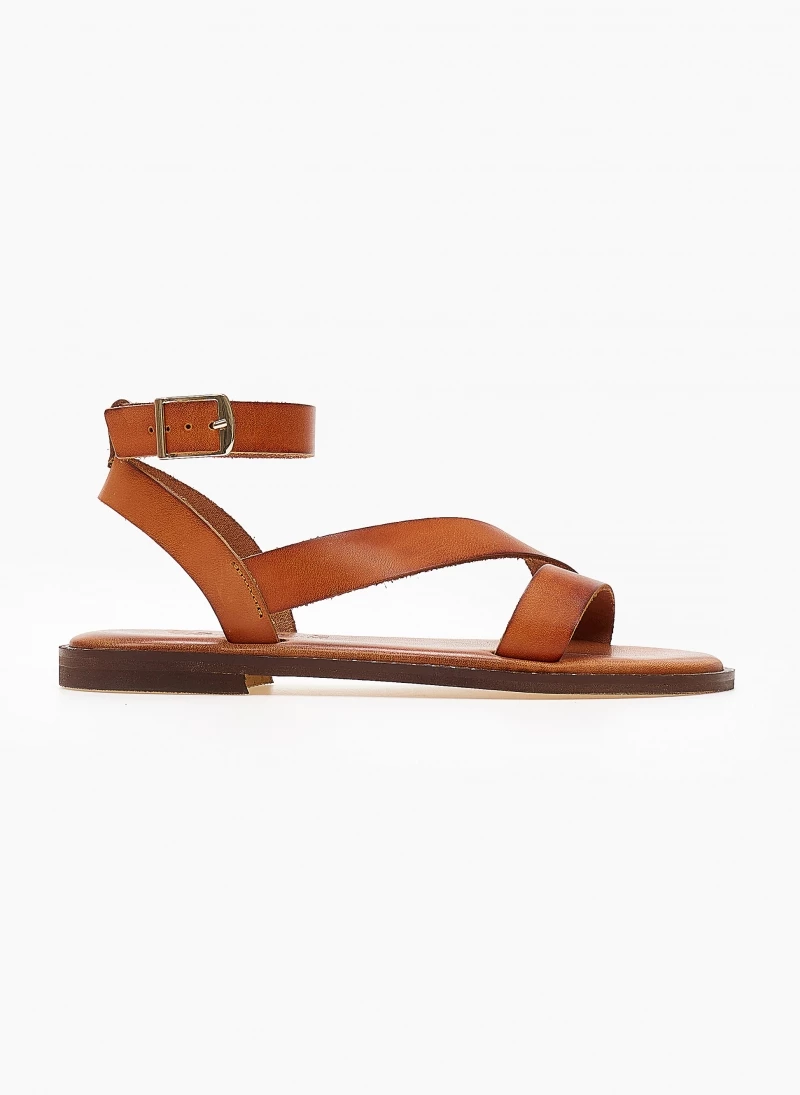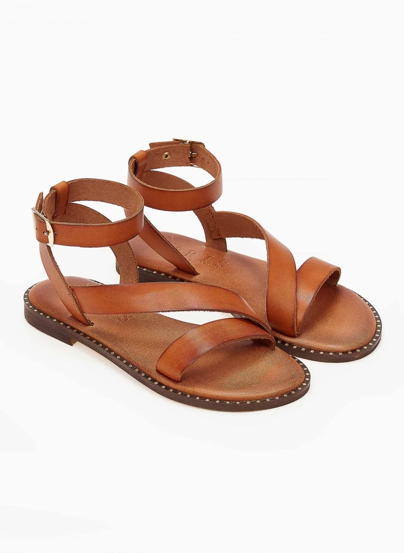 Δερμάτινα σανδάλια IRIS με λοξό λουράκι στο κουτεπιέ. Δένουν με μπαρέτα στο ύψος του αστραγάλου. Δερμάτινος πάτος με ενίσχυση. Ελληνικής κατασκευής,χειροποίητα.