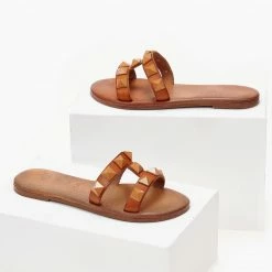 Δερμάτινα φλατ σανδάλια IRIS με μεγάλα τρουκς. Χειροποίητα,ελληνικής κατασκευής.
