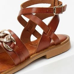 Σανδάλια δερμάτινα TFP με αλυσίδα στη φάσα. Δένουν με χιαστί λουράκι στο ύψος του αστραγάλου. Λεπτομέρεια μικρά μεταλλικά τρουκς περιμετρικά της σόλας. Μαλακός πάτος με ενίσχυση. Ελληνικής κατασκευής.