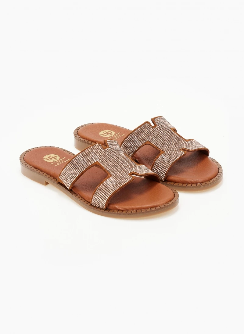 Σανδάλια δερμάτινα TFP με μικρά strass. Έχουν φάσα με ανοίγματα στο πλάι. Δερμάτινος πάτος με ενίσχυση. Ελληνικής κατασκευής.