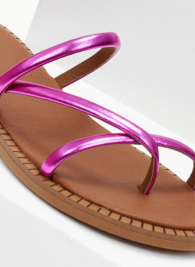 Σανδάλια δερμάτινα TFP με στρογγυλεμένα λουράκια σε μεταλλικά χρώματα. Ανάγλυφο σχέδιο περιμετρικά της σόλας. Δερμάτινος πάτος με ενίσχυση. Ελληνικής κατασκευής.