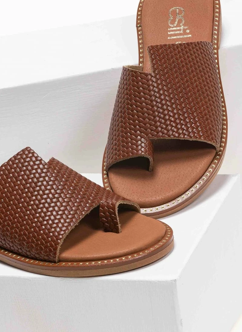 Estili δερμάτινα σανδάλια με άνισο τελείωμα. Έχουν ανάγλυφο pattern ψάθα. Ο πάτος είναι δερμάτινος με ενίσχυση. Ελληνικής κατασκευής, χειροποίητα.