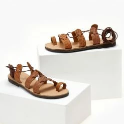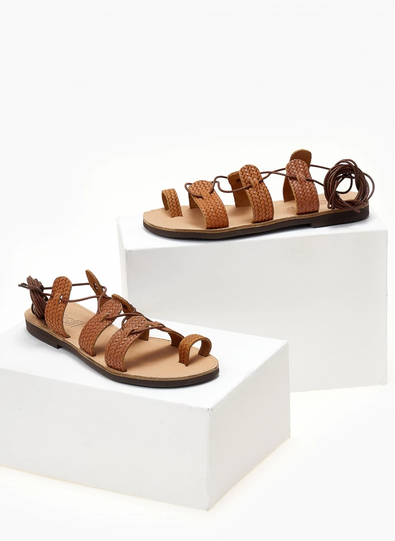 Σανδάλια ESTIL δερμάτινα με pattern ψάθα. Δένουν με κορδόνια στο ύψος της γάμπας. Ελληνικής κατασκευής.
