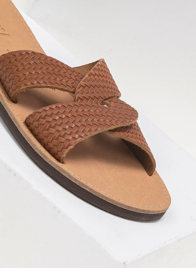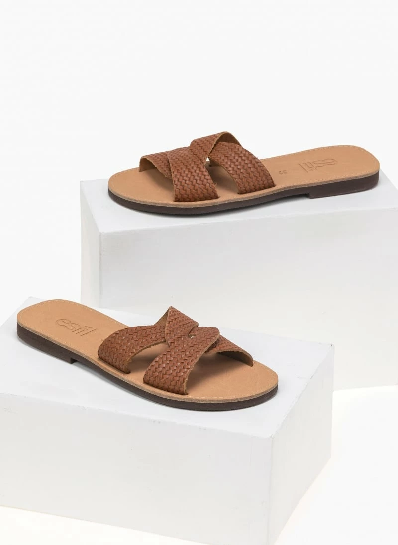 Estil δερμάτινα σανδάλια με περαστές φάσες και ανάγλυφο σχέδιο ψάθα. Ελληνικής κατασκευής, χειροποίητα.