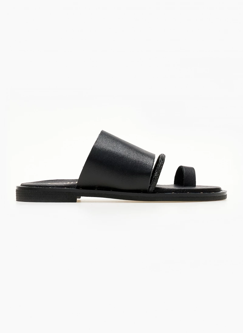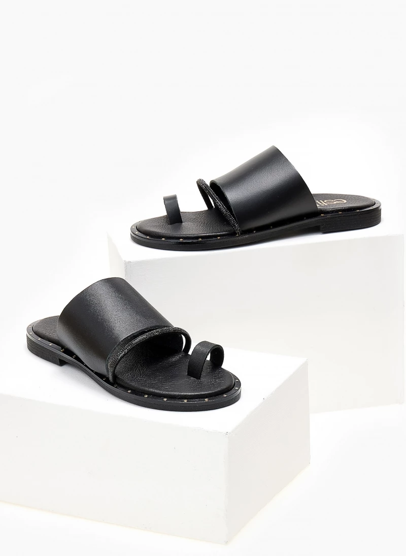 ESTIL δερμάτινα σανδάλια με φαρδιά φάσα. Έχουν λεπτή σειρά strass. Λεπτομέρεια σε μεταλλικό χρώμα περιμετρικά της σόλας. Δερμάτινος πάτος με ενίσχυση. Ελληνικής κατασκευής.