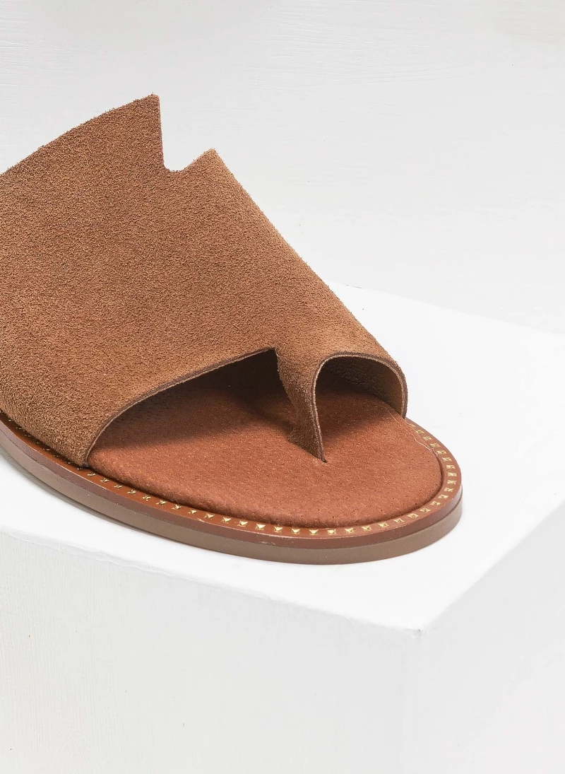 Estil σανδάλια από καστόρι δέρμα με άνισο τελείωμα. Ο πάτος είναι δερμάτινος με ενίσχυση. Η σόλα είναι μαλακή. Ελληνικής κατασκευής.