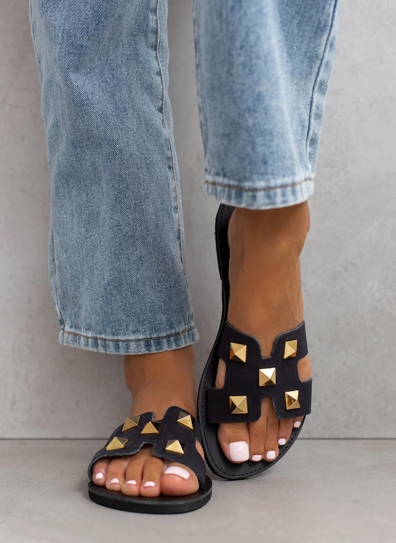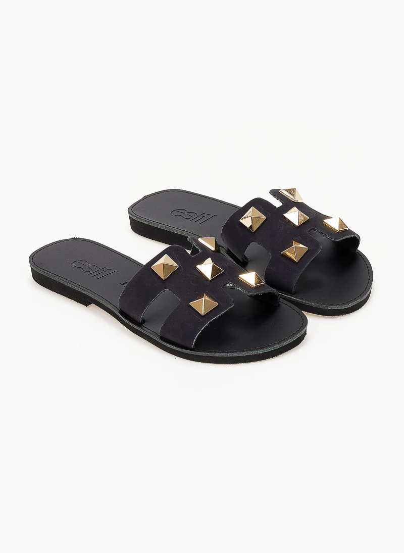 Σανδάλια από nubuck δέρμα με ανοίγματα στο πλάι. Έχουν μεταλλικά τρουκς. Ελληνικής κατασκευής,χειροποίητα.