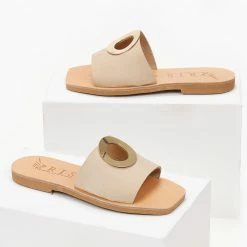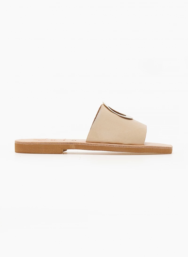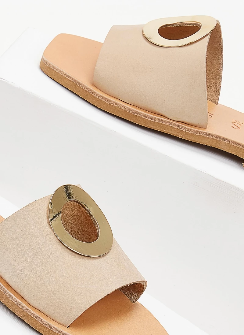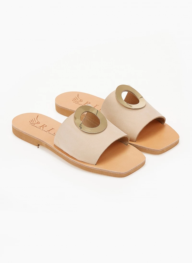 Σανδάλια από nubuck δέρμα με φαρδιά φάσα. Έχουν μεταλλικό στοιχείο με άνοιγμα σε σχήμα κύκλο. Δερμάτινος πάτος. Ελληνικής κατασκευής,χειροποίητα.