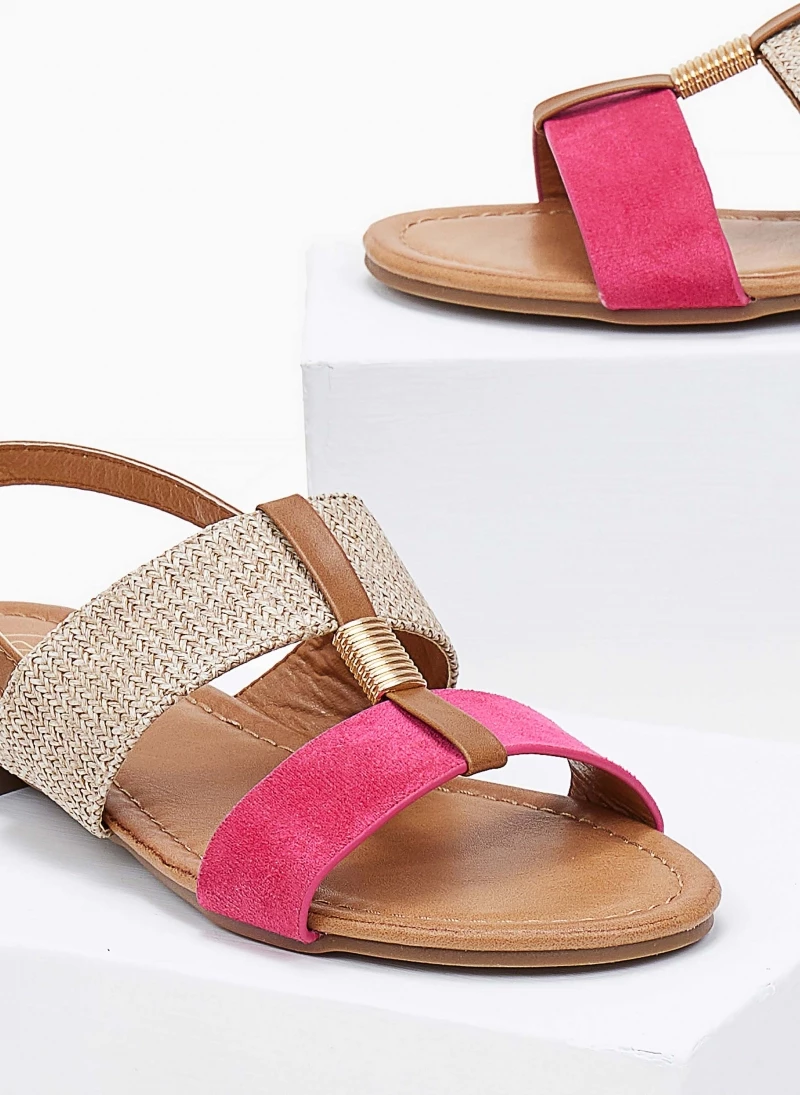 Φλατ πέδιλα με ψάθινη φάσα. Συνδυάζουν τεχνόδερμα και suede. Έχουν μεταλλικό στοιχείο στο κουτεπιέ. Κλείνουν με λουράκι στο πλάι. Η σόλα είναι μαλακή από λάστιχο.