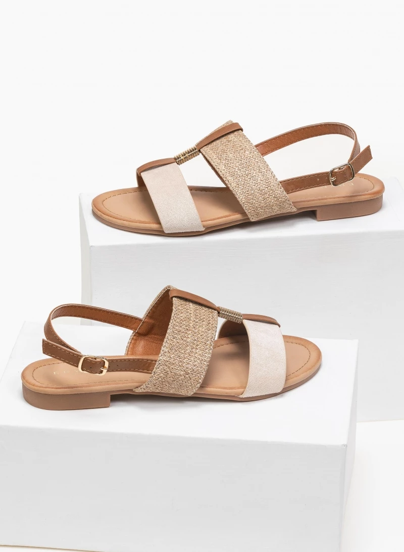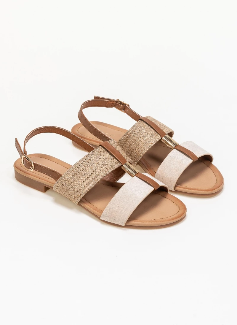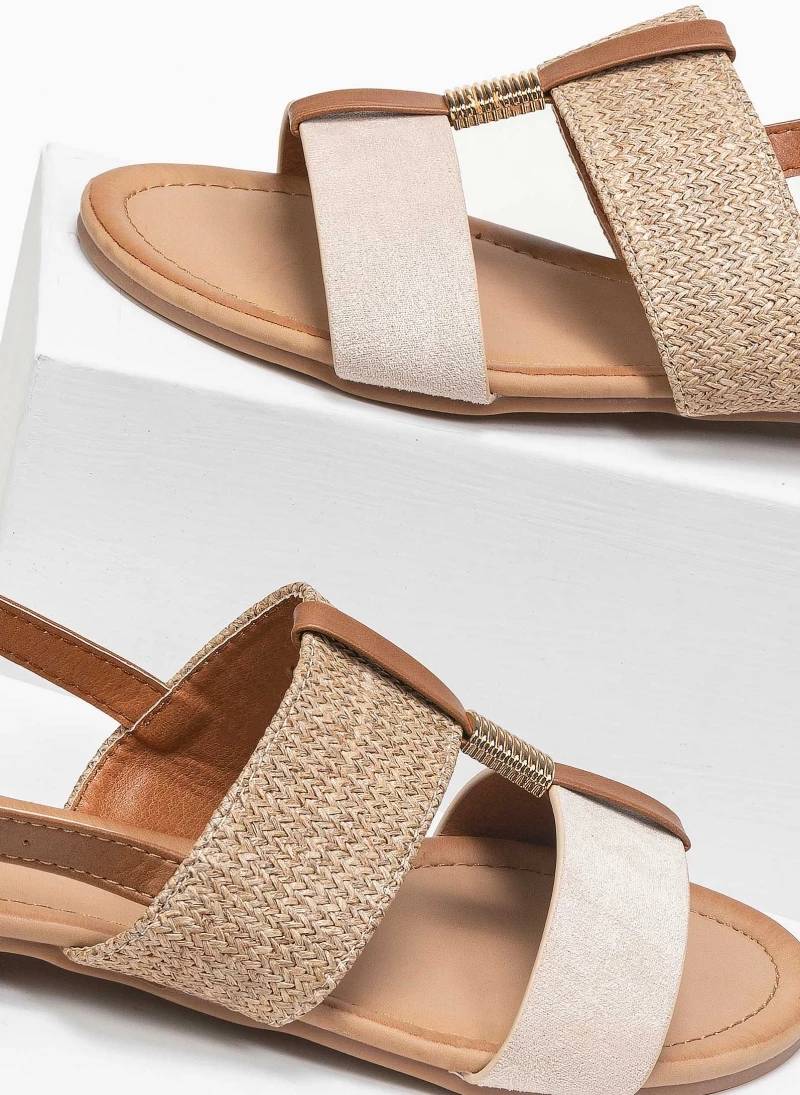 Φλατ πέδιλα με ψάθινη φάσα. Συνδυάζουν τεχνόδερμα και suede. Έχουν μεταλλικό στοιχείο στο κουτεπιέ. Κλείνουν με λουράκι στο πλάι. Η σόλα είναι μαλακή από λάστιχο.