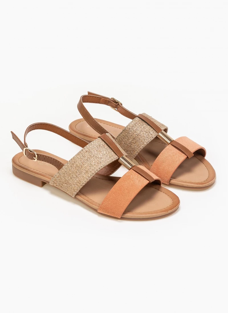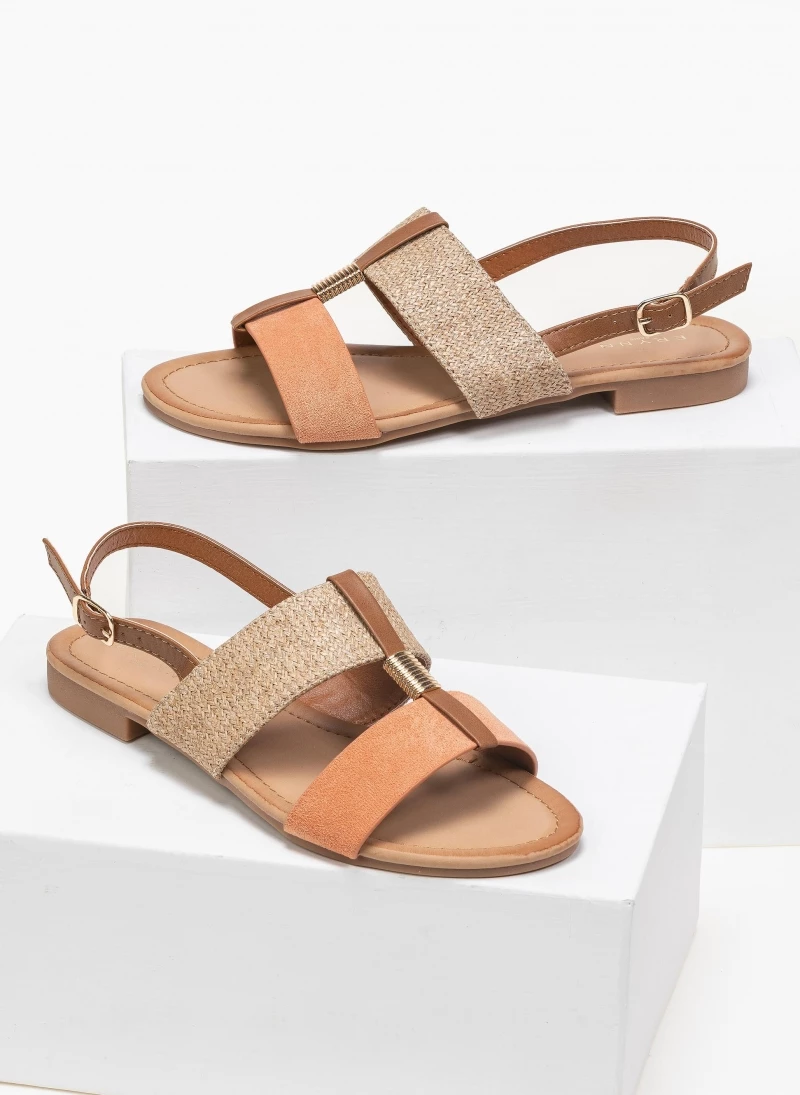 Φλατ πέδιλα με ψάθινη φάσα. Συνδυάζουν τεχνόδερμα και suede. Έχουν μεταλλικό στοιχείο στο κουτεπιέ. Κλείνουν με λουράκι στο πλάι. Η σόλα είναι μαλακή από λάστιχο.