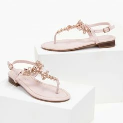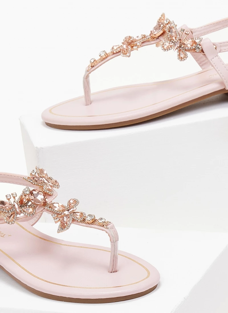 Φλατ πέδιλα με πέτρες και διακριτικά strass σε σχέδιο πεταλούδα. Δένουν στο πλάι.