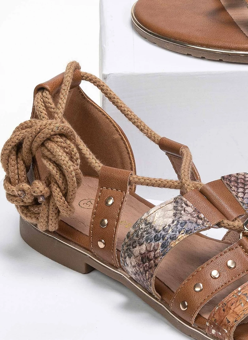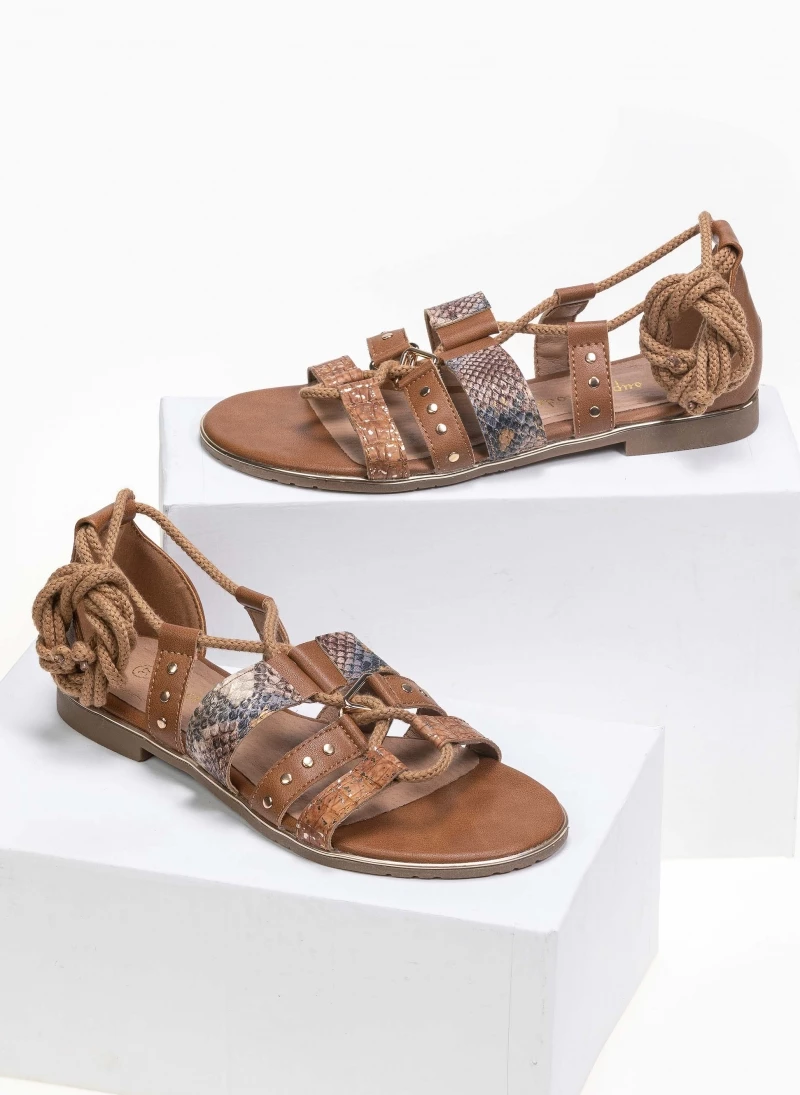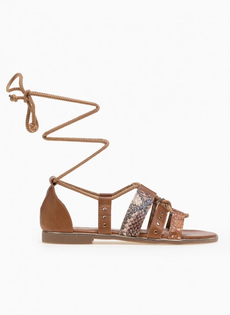 Ίσια πέδιλα με animal print λουράκια. Έχουν μεταλλική λεπτομέρεια περιμετρικά της σόλας. Η φτέρνα είναι κλειστή και δένουν με κορδόνια. Η σόλα είναι από λάστιχο.