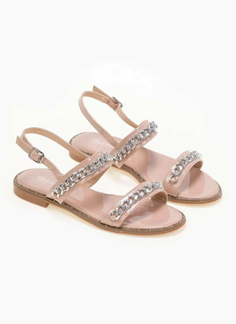 Λουστρίνι φλατ σανδάλια με αλυσίδα στα λουράκια. Έχουν διακριτικά μεταλλικά τρουκς περιμετρικά της σόλας.