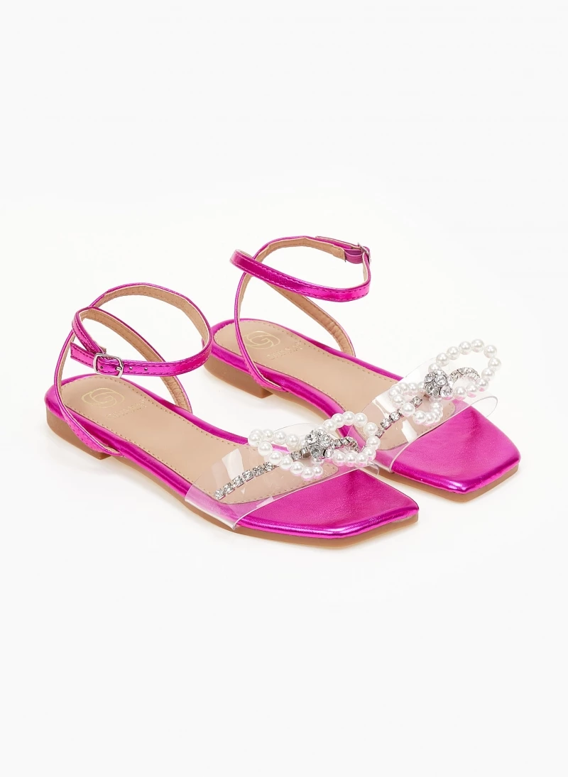 Σανδάλια διαφάνεια με διακοσμητικό φιόγκο με πέρλες και strass. Δένουν με μπαρέτα στο ύψος του αστραγάλου. Kαρέ γραμμή.