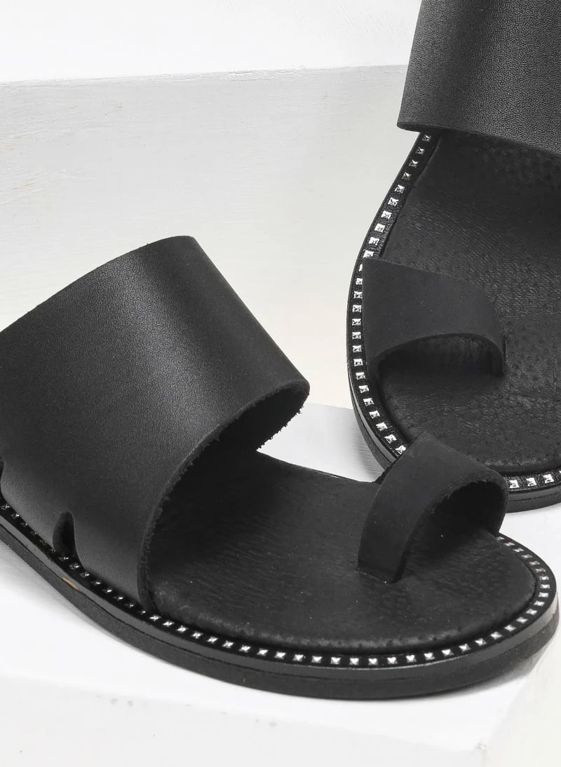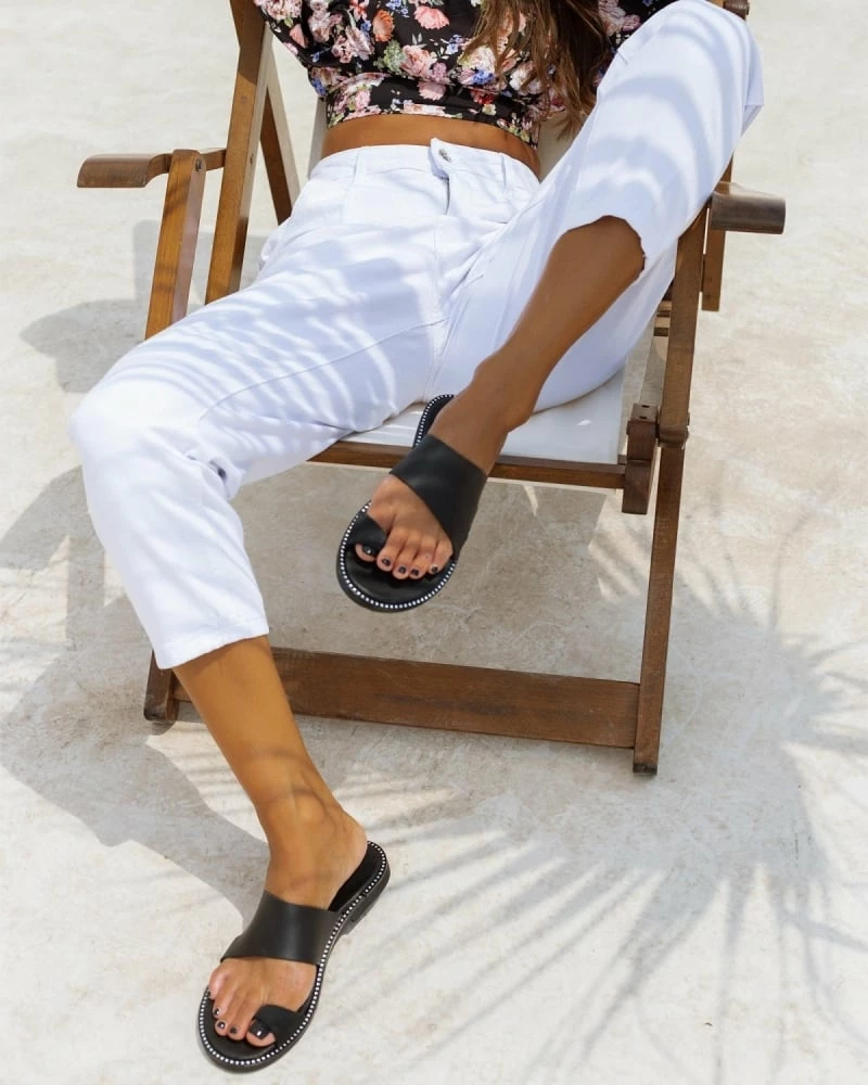 Estil δερμάτινα σανδάλια με λοξή φάσα με ανοίγματα. Ο πάτος είναι δερμάτινος με ενίσχυση. Έχουν λεπτομέρεια μεταλλικό χρώμα περιμετρικά της σόλας. Ελληνικής κατασκευής.