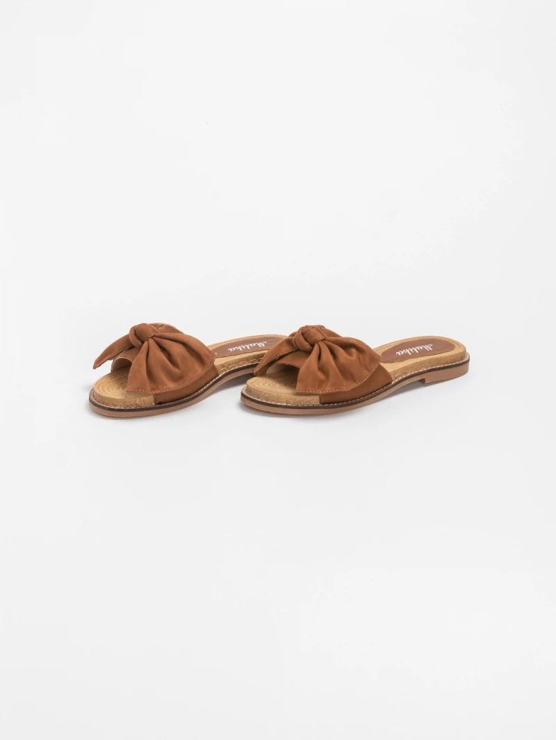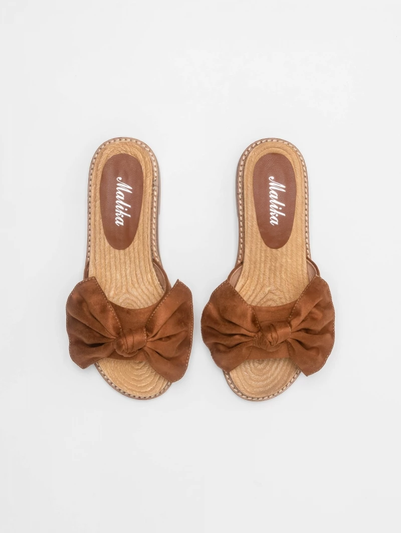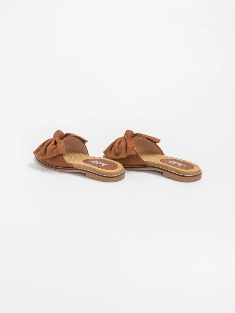 Flat suede πέδιλα με μεγάλο φιόγκο. Ο πάτος είναι σχοίνινος. Μαλακή σόλα από λάστιχο.