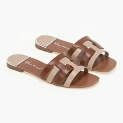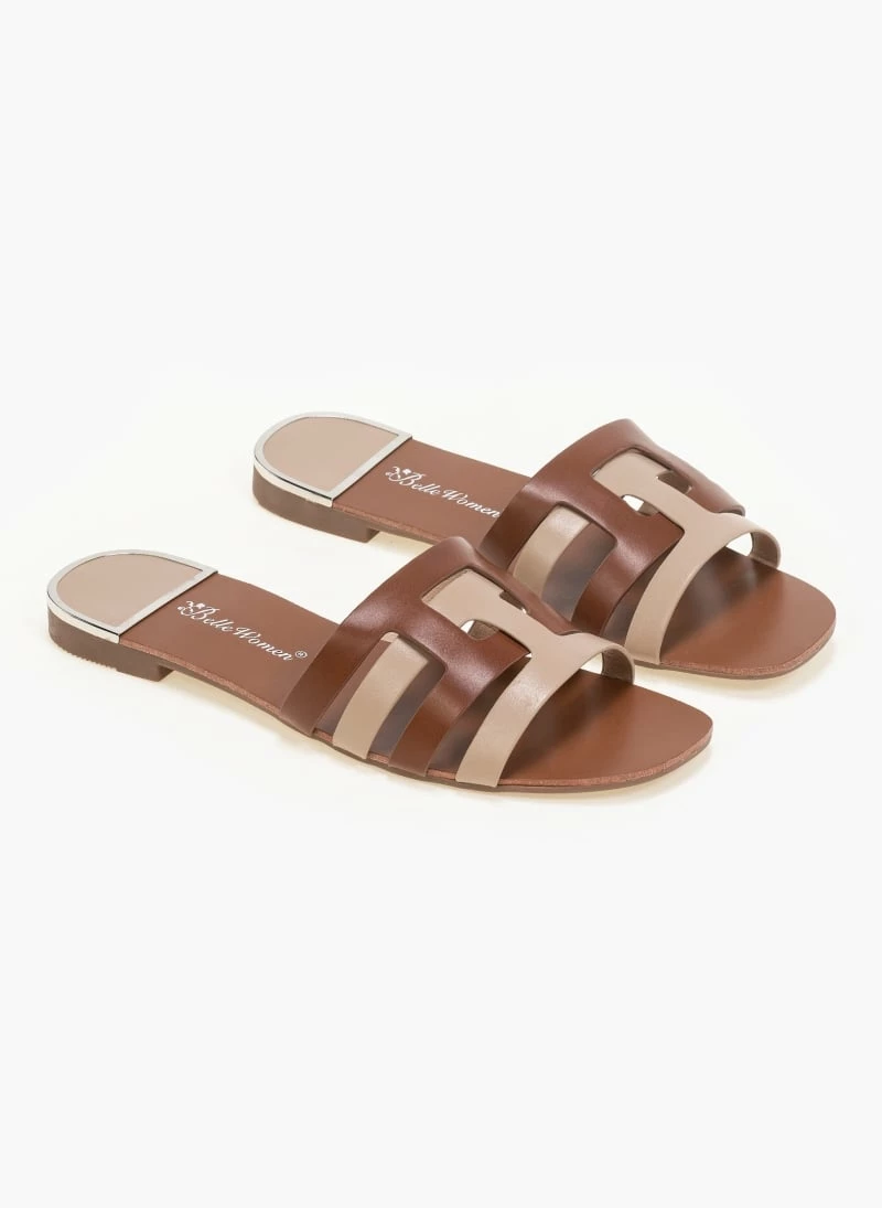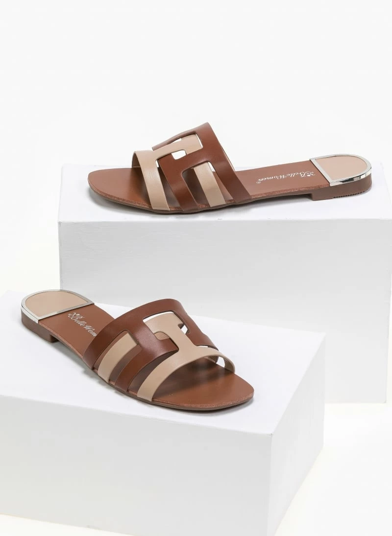 Φλατ σανδάλια σε συνδυασμούς χρωμάτων. Έχουν μέταλλο στη φτέρνα. Καρέ γραμμή.