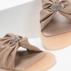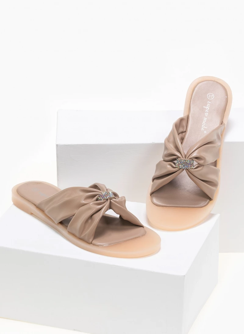 Σανδάλια φλατ με μαλακές τσαλακωτές φάσες και strass διακοσμητικό. Η σόλα είναι μαλακή από λάστιχο.