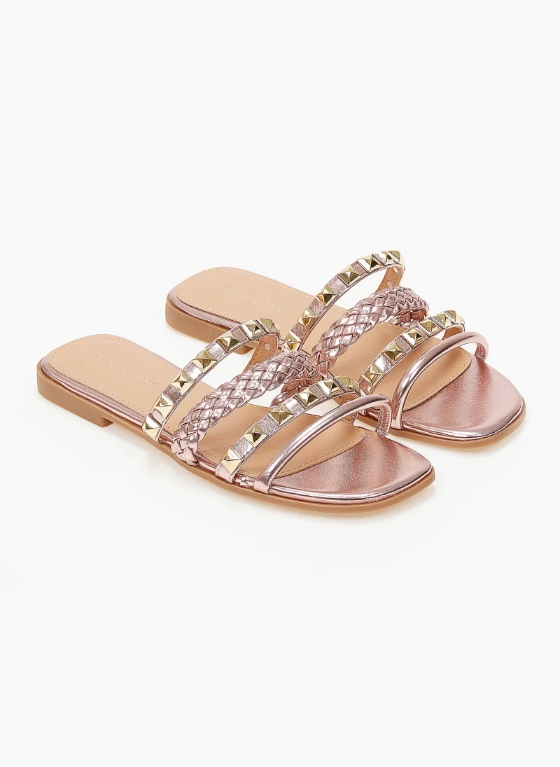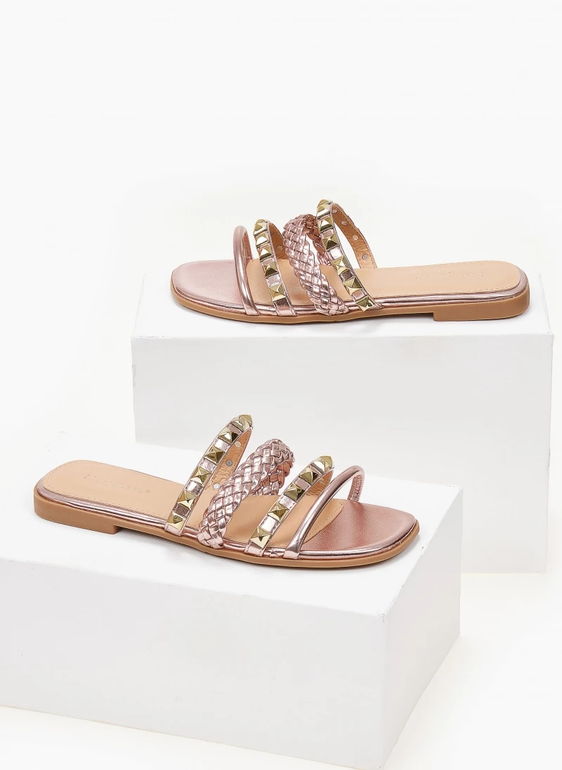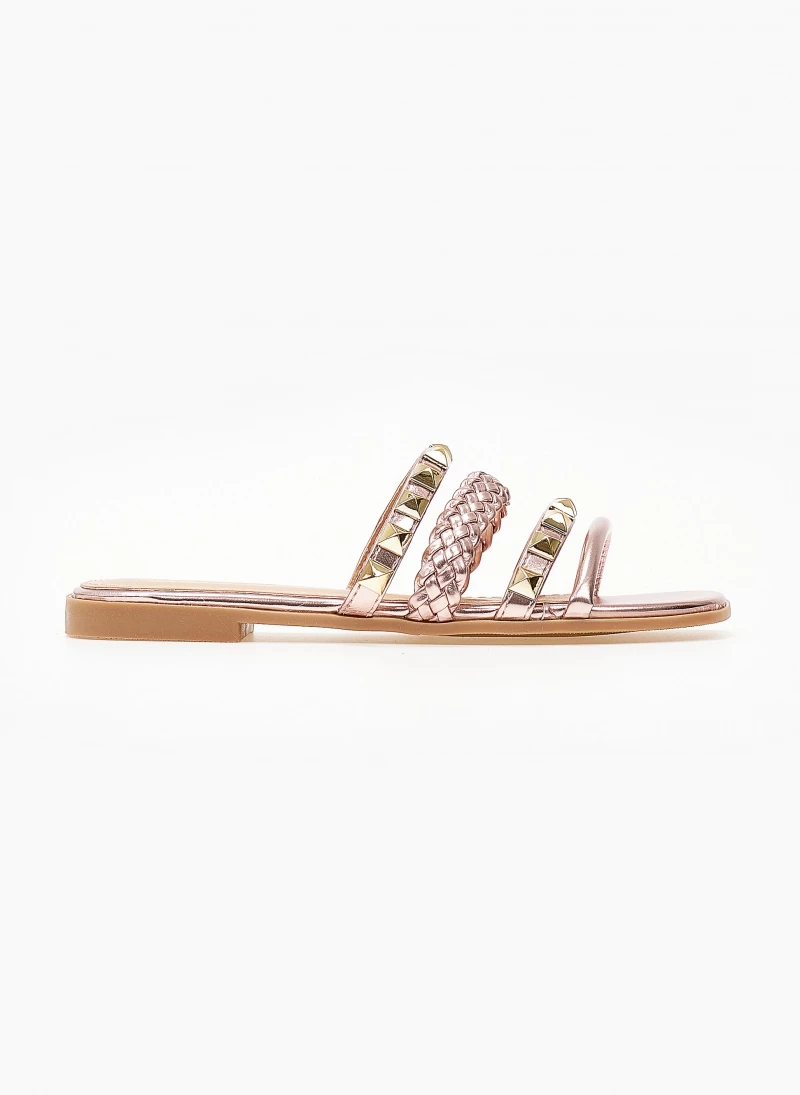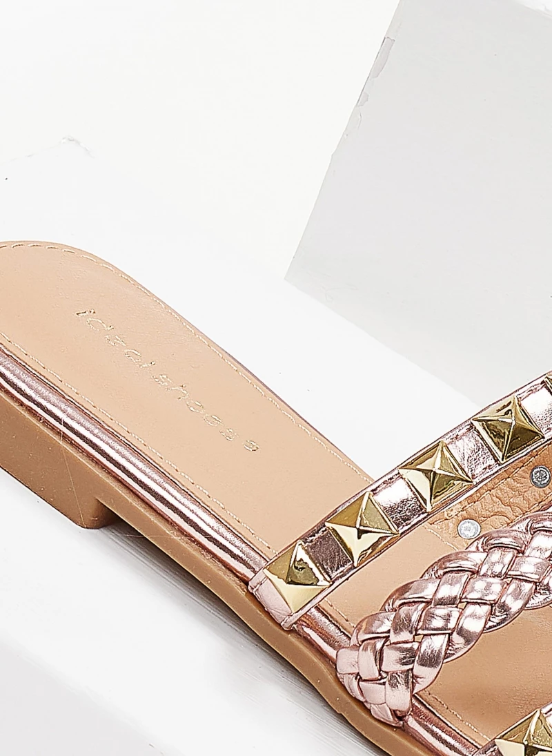 Σανδάλια σε μεταλλικά χρώματα. Έχουν πλεκτό λουράκι και τρουκς. Η σόλα είναι από λάστιχο.