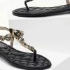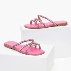 Σανδάλια φλατ σε καρέ γραμμή. Έχουν τρία λουράκια στο κουτεπιέ τα οποία είναι στολισμένα με strass.